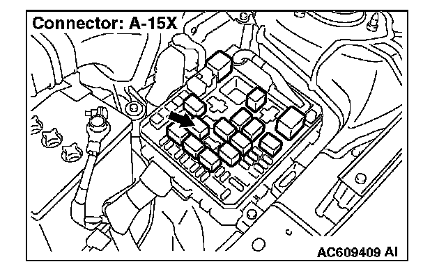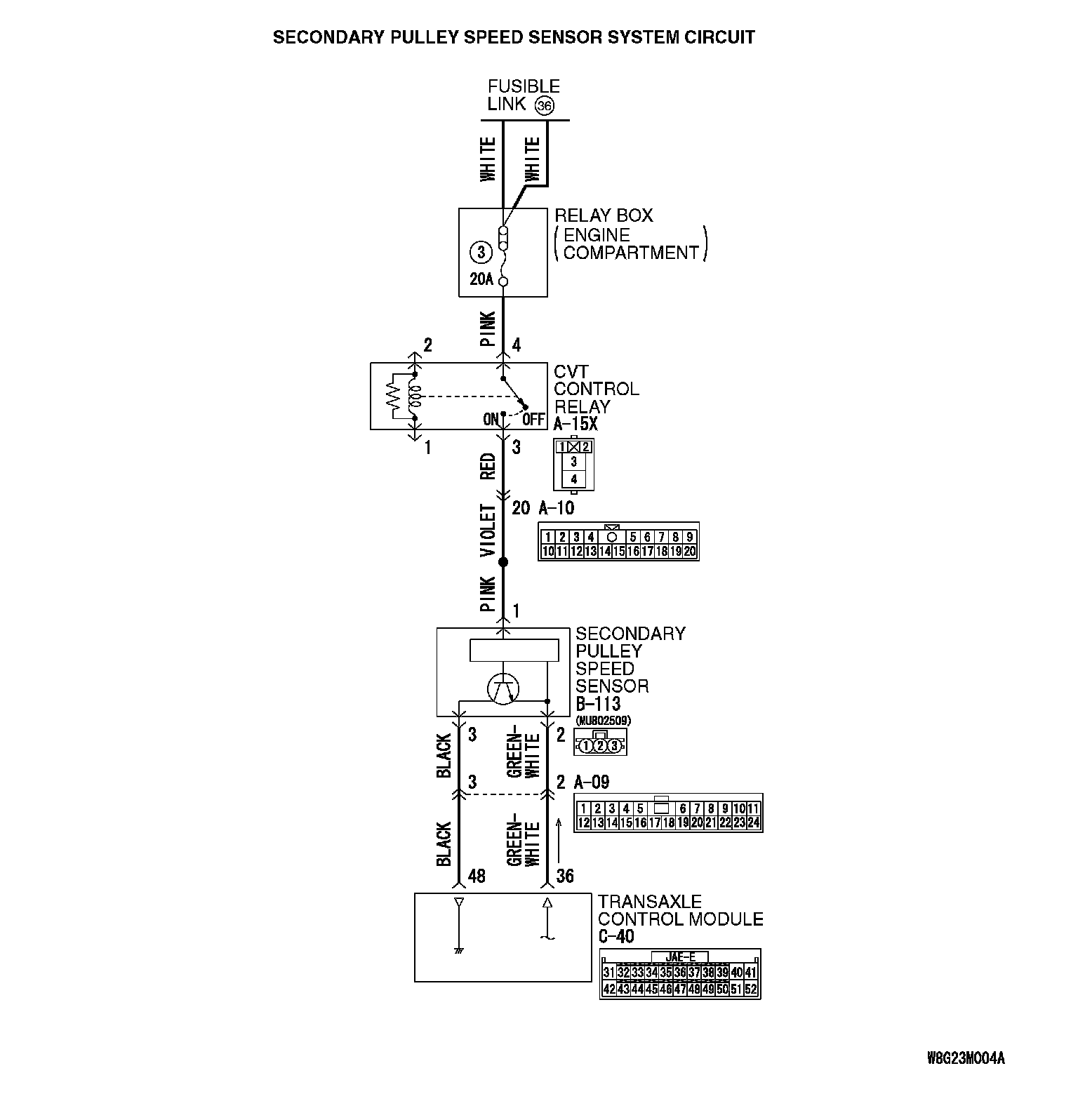 Between A-15X CVT control relay (terminal No.3) and B-113 secondary pulley speed sensor connector (terminal No.1)