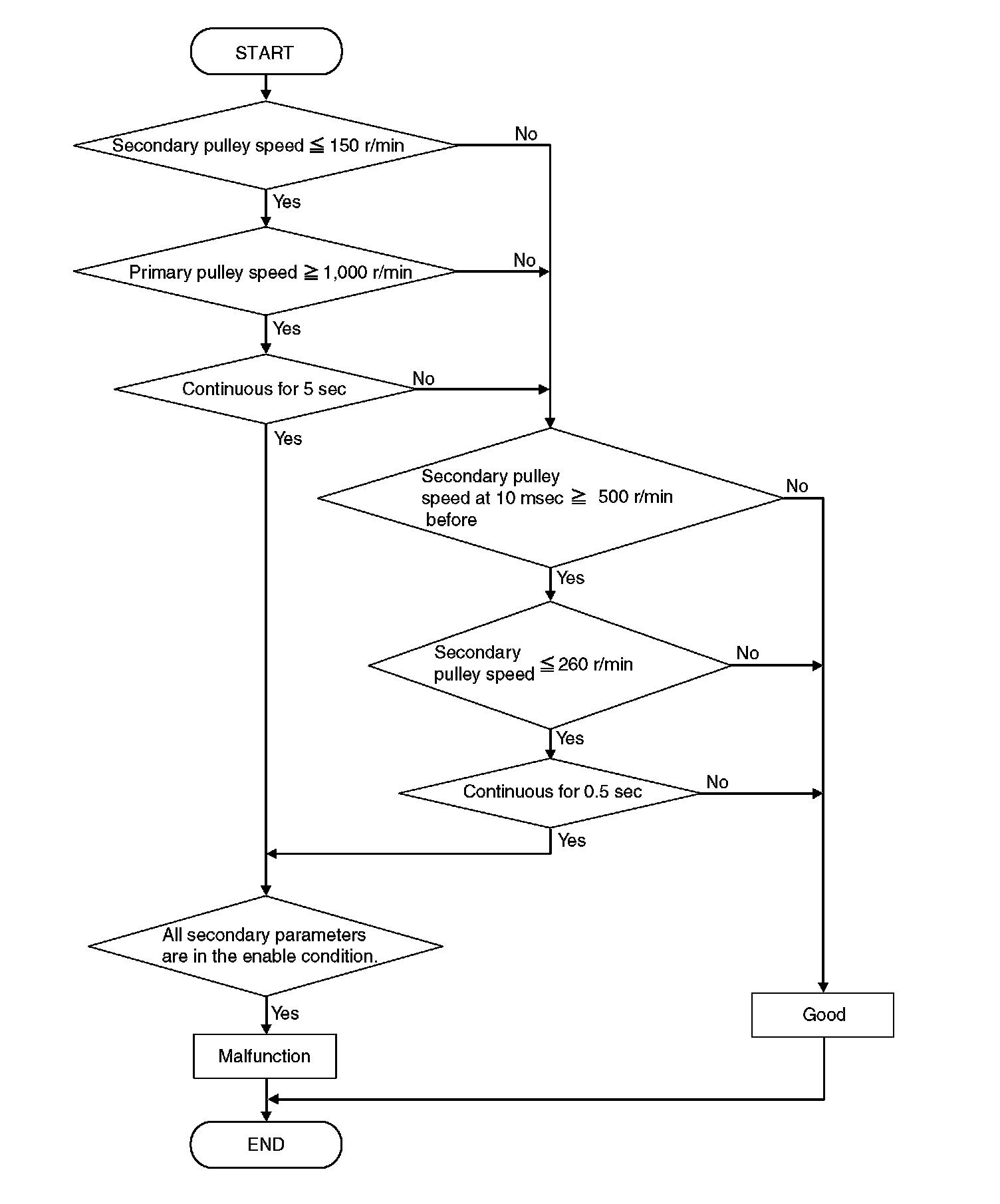 TCM determines that the malfunction is present when the secondary pulley speed sensor value changes abruptly or when there is a discrepancy between this sensor and other sensors in sensor reading.