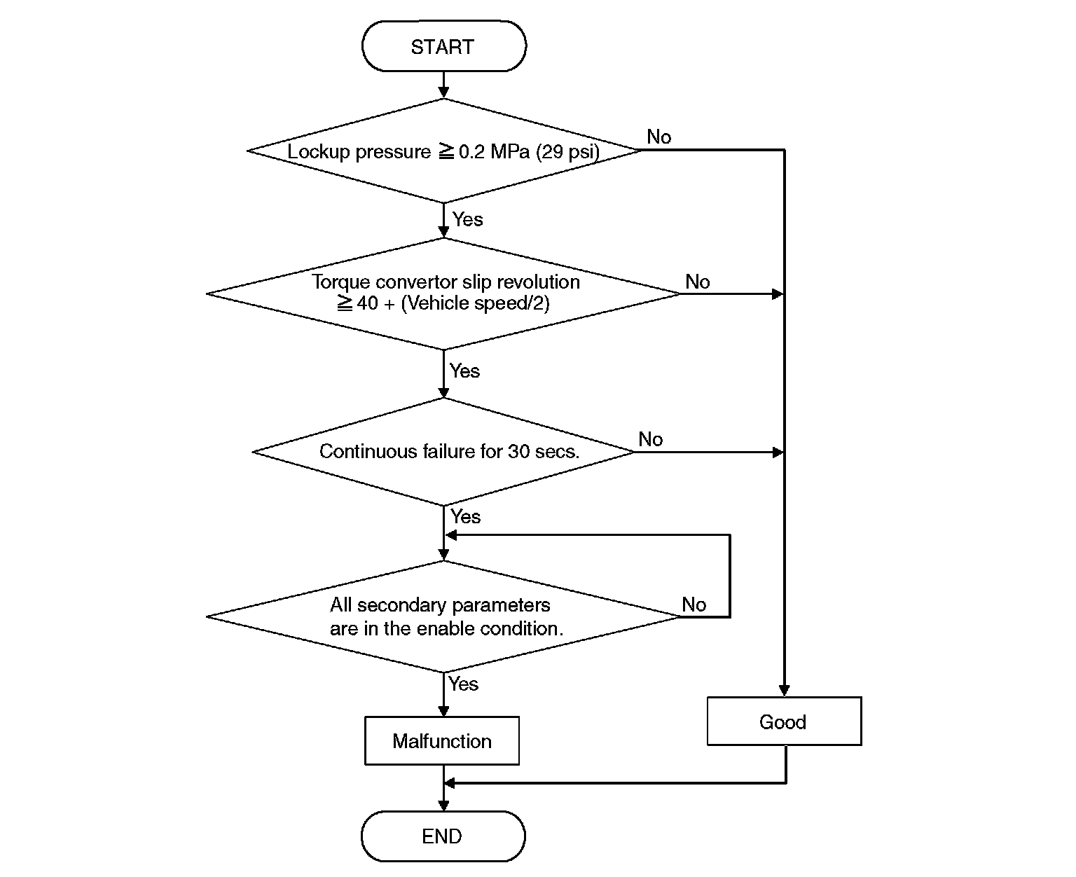 ^ The status with the high torque converter slip speed continues for 30 seconds during lockup control [Primary pulley speed and engine speed are normal, and lockup differential pressure is 0.2 MPa (29 psi) or more].
