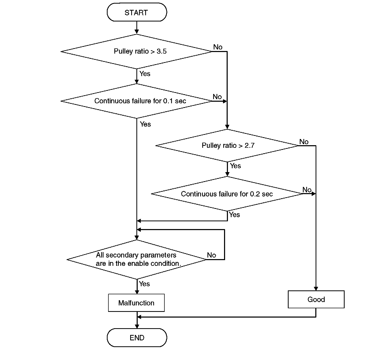 TCM determines that the malfunction is present when pulley ratio becomes higher (pulley ratio range: 2.349 to 0.394).