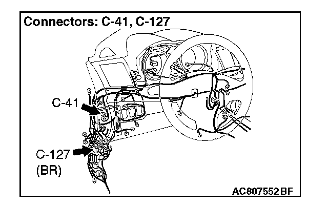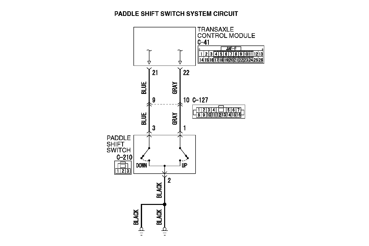 Between C-41 TCM connector (terminal No.22) and C-210 paddle shift switch connector (terminal No.1)