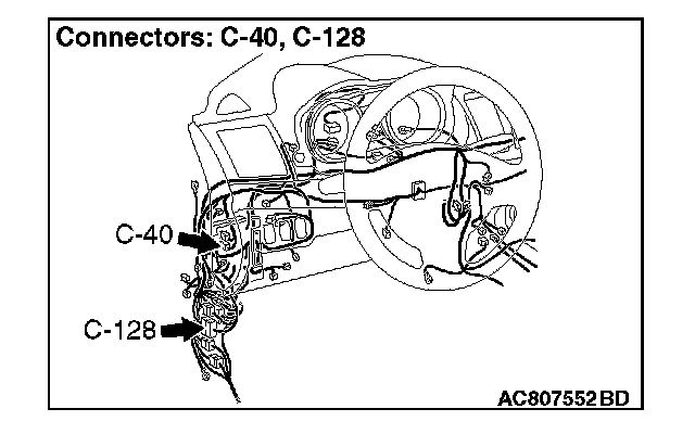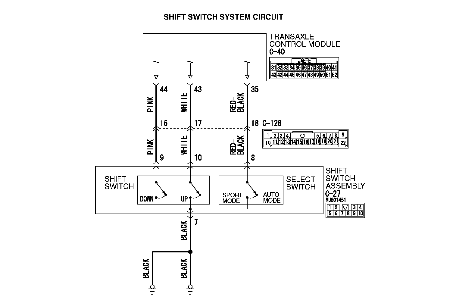 ^ Between C-40 TCM connector (terminal No.44) and C-27 selector lever assembly connector (terminal No.9)