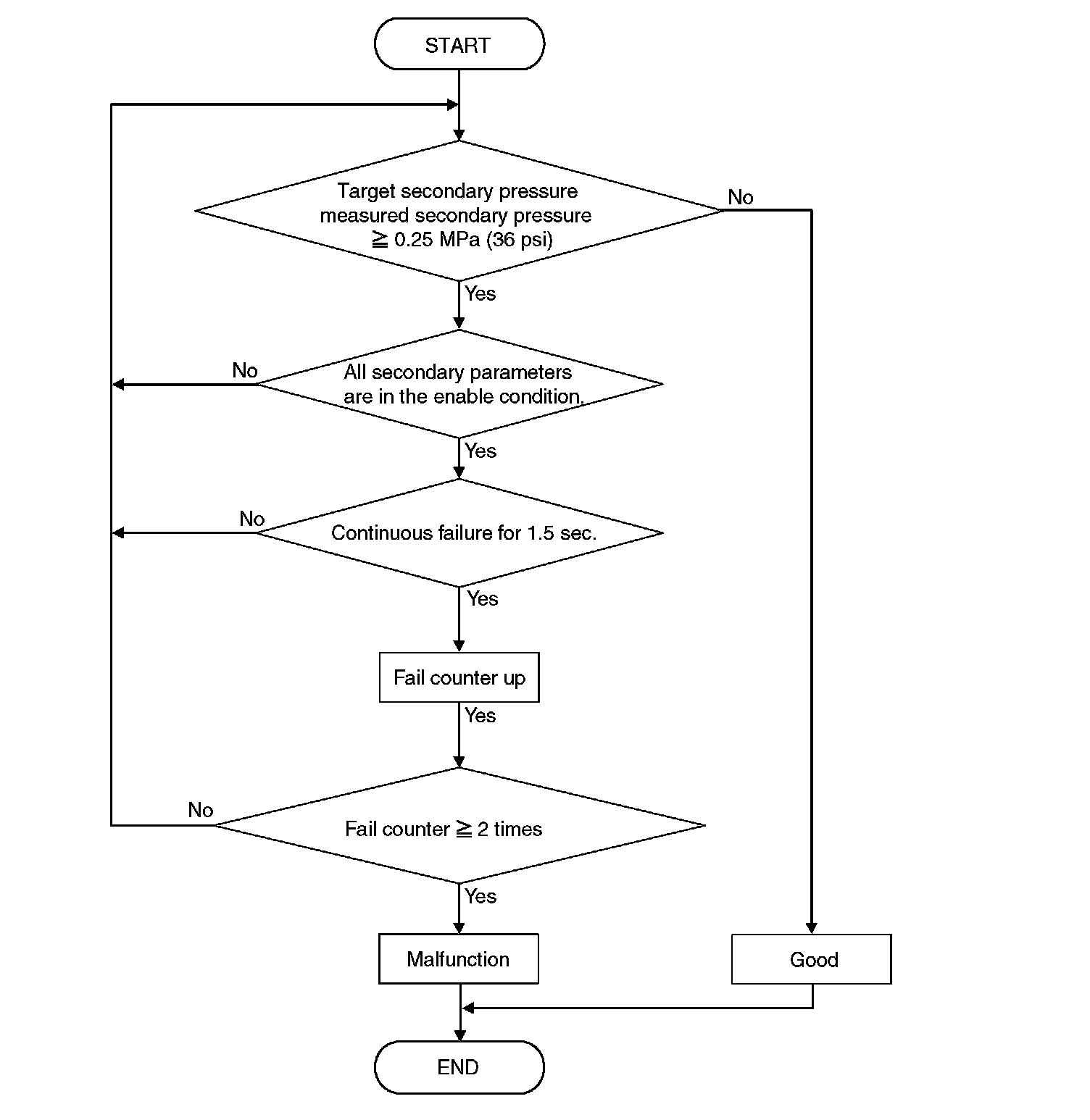 ^ Secondary linear solenoid performance fail [target secondary pressure-measured secondary pressure: 0.25 MPa (36 psi) or more. (1.52 seconds)]: 2 count or more.
