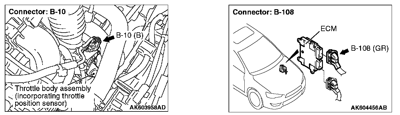 STEP 7. Check harness connector B-10 at electronic-controlled throttle valve and harness connector B-108 at ECM for damage.