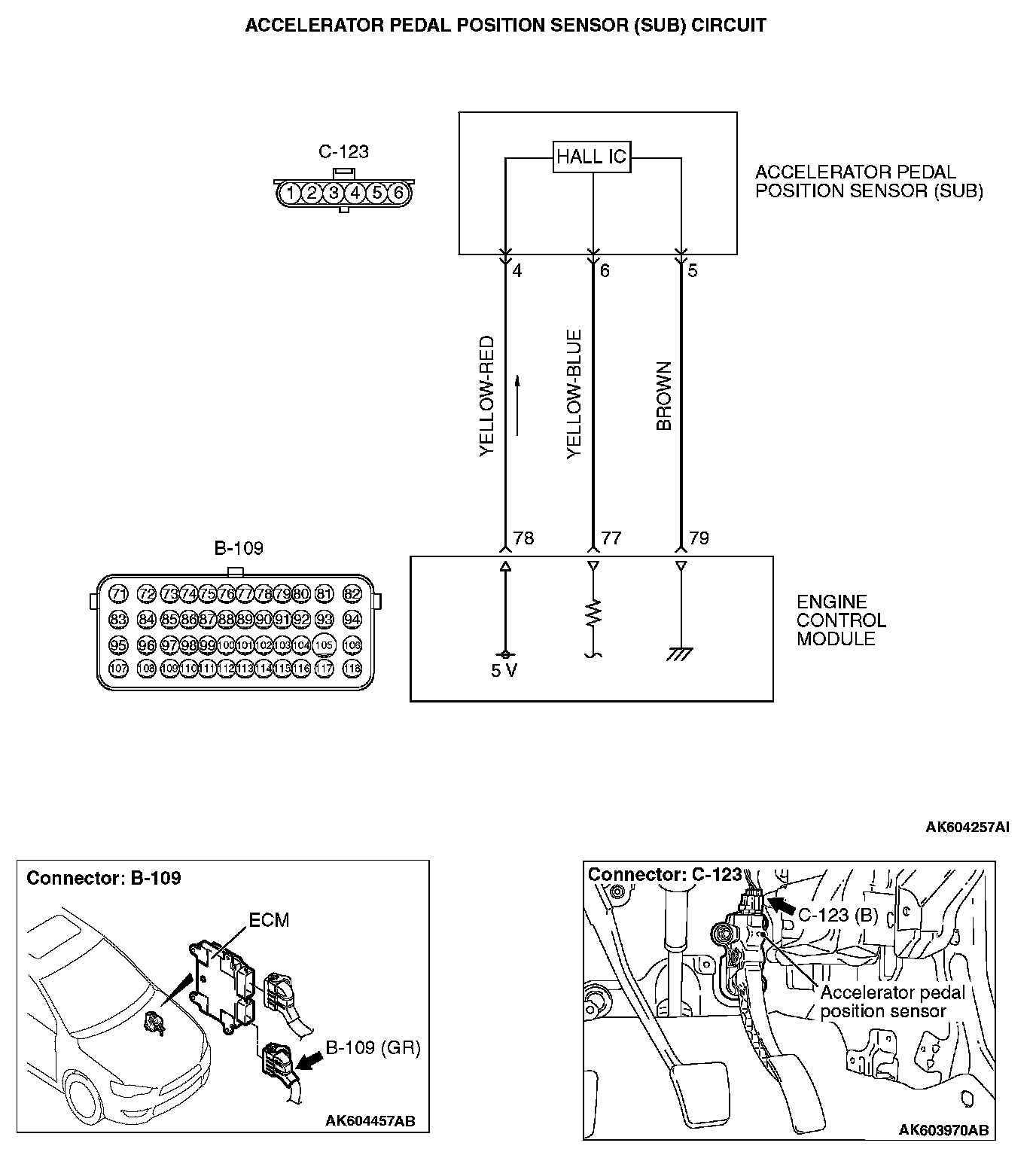 - A 5-volt power supply is applied on the accelerator pedal position sensor (sub) power terminal (terminal No. 4) from the ECM (terminal No. 78).
