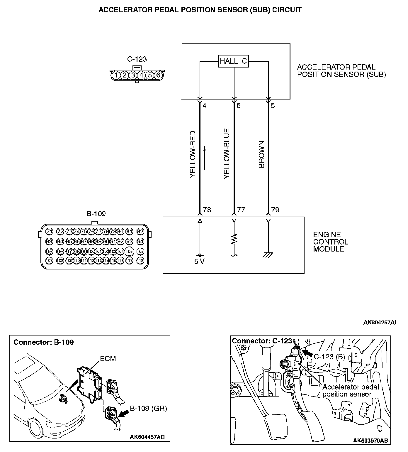 STEP 5. Check for open circuit and harness damage between accelerator pedal position sensor connector C-123 (terminal No. 5) and ECM connector B-109 (terminal No. 79).