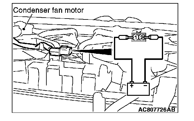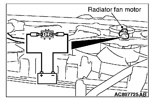 2. Check that the fan motor runs when a positive battery terminal is connected to the fan motor-side connector terminal number 1, and terminal number 2 is grounded. Also check to see that there is no abnormal sound emitted from the fan motor at this time.