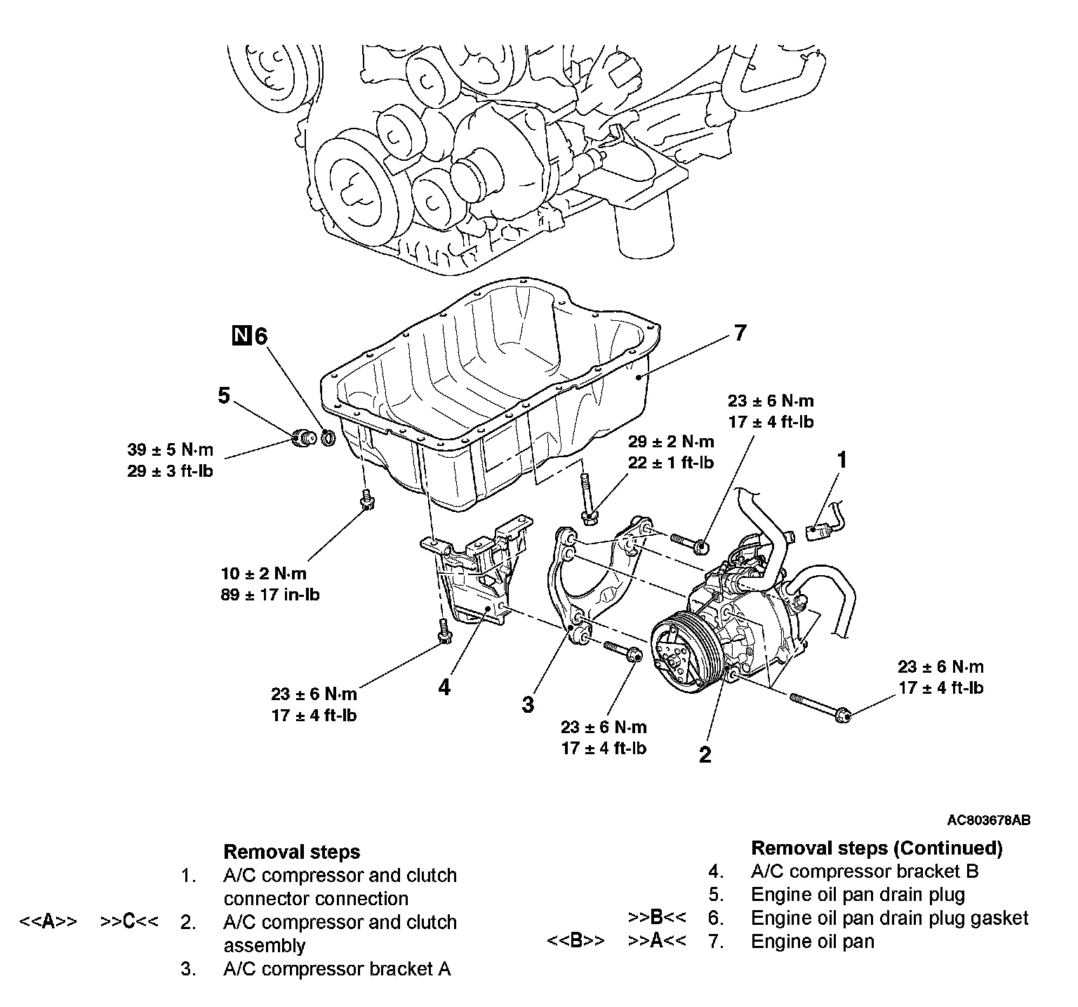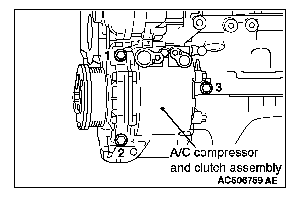 Tighten A/C compressor and clutch assembly mounting bolts to the specified torque in the order of number shown in the illustration.