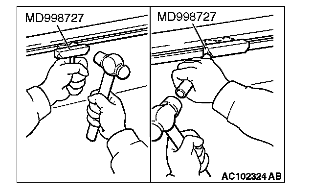 Do not forcibly drive in special tool MD998727 to avoid damage to the engine oil pan seal surface of cylinder block assembly.