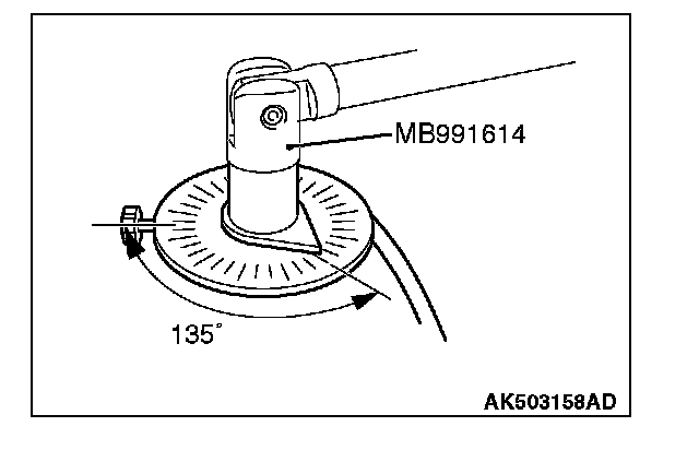 10. After tightening them to the specified tightening torque of 20 Nm again, use special tool MB991614 to tighten them up to 135°.