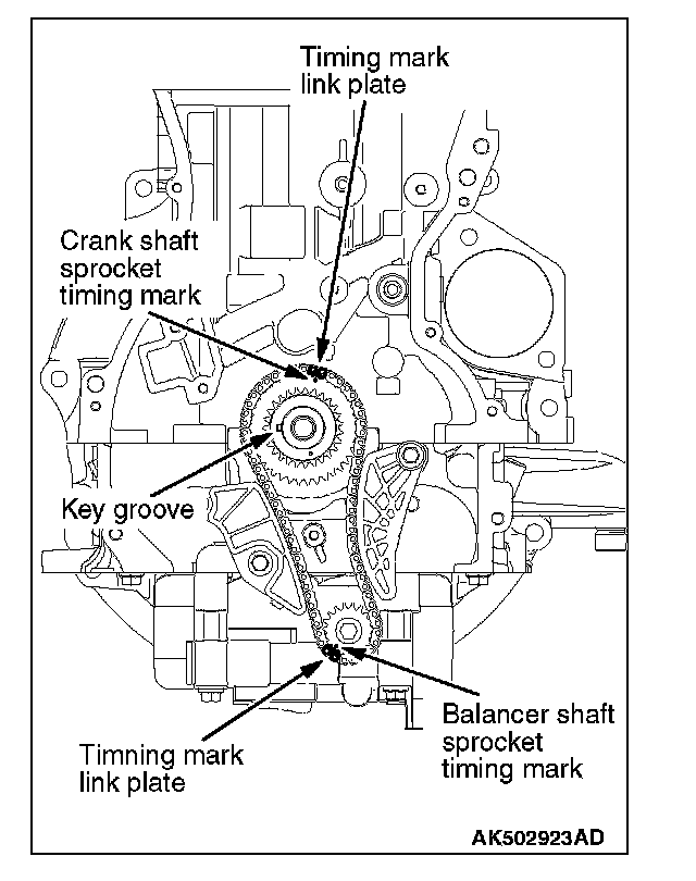 7. While slanting the balancer shaft module, align the link plate of another balancer chain with the timing mark of the crankshaft sprocket to loop. Gradually push in the crankshaft sprocket and fit it into the key groove of the crankshaft. Then, install the balancer shaft module on the ladder frame.