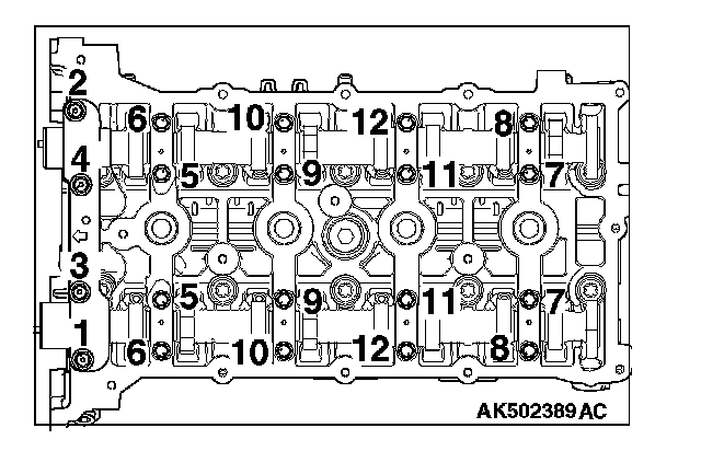 6. Tighten each camshaft bearing cap mounting bolt to the specified torque in the order of number shown in the figure in two or three steps.