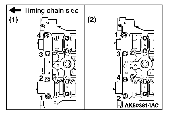 First remove a mounting bolt of the front camshaft bearing cap and then a mounting bolt of each camshaft bearing cap in the order shown in the illustration.