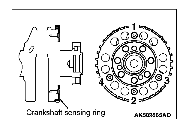 Tighten crankshaft sensing ring bolts to specified torque in the tightening order shown in the illustration.