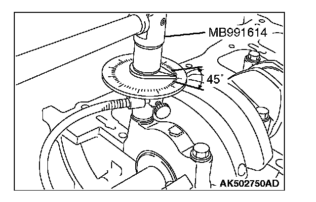 5. Use special tool Angle gauge (MB991614) to tighten bolts 45° according to the tightening order.