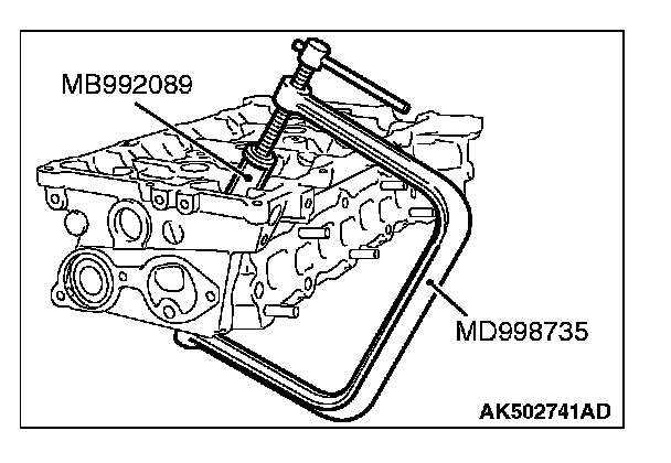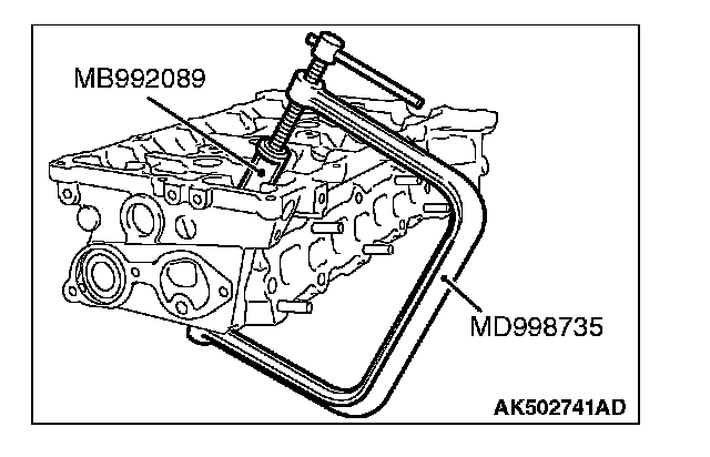 Use a special tool MB998735, and MB992089 to compress the valve spring and to remove the retainer lock.