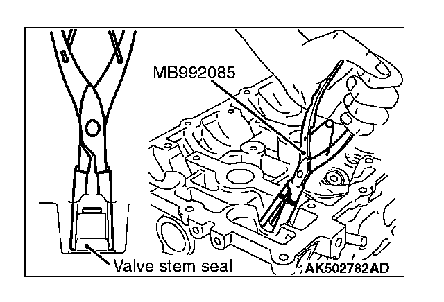 Use special tool MB992085 to firmly pinch the base (larger external shape) of the stem seal and twist it right and left for pulling out.