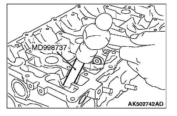 2. Use special tool MB998737 to press fit the valve stem seal into the valve guide with the valve stem used as a guide.