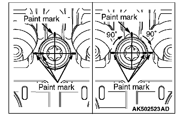 Tighten it further 90° and make sure that the paint mark on the cylinder head bolt is in a straight line with that on the cylinder head.