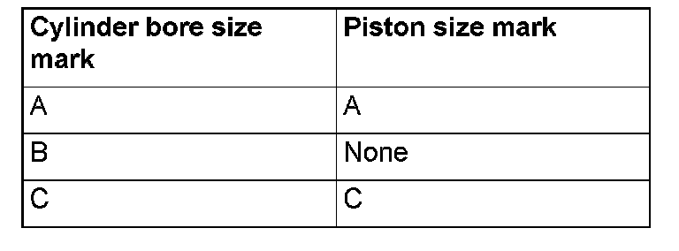 1. When replacing a piston, check the cylinder bore size mark stamped on the illustrated position of the cylinder block and select a corresponding piston from the table below.