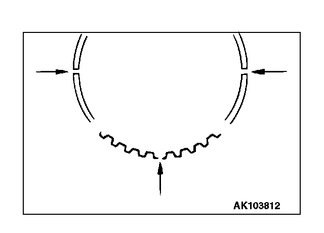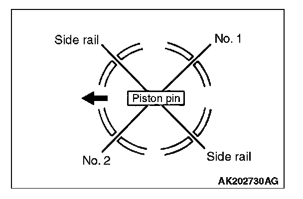2. Arrange end gap positions of piston rings and oil ring (side rail and spacer) as shown in the illustration.