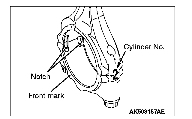 1. Assemble the bearing cap on the connecting rod by aligning it with the mark put during removal. If a new connecting rod without a mating mark is used, assemble so that the detent notch of the bearing is on the same side as illustrated.