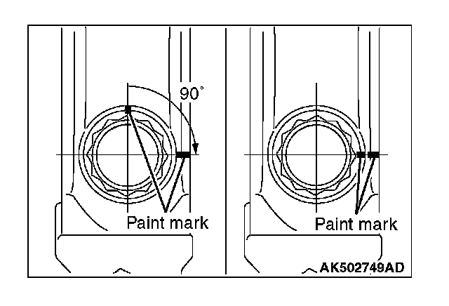 8. Tighten the bolt 90°, and make sure that the paint mark of the connecting rod is aligned with that of the bolt.