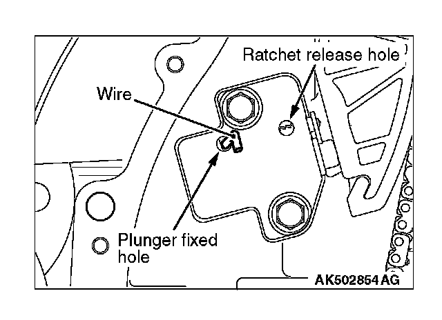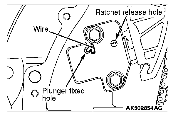 2. Push the tensioner lever by hand and push in the plunger of the timing chain tensioner until it hits the bottom. Then, insert a hard wire (piano wire or the like) of [diameter] 1.5 or hexagonal bar wrench (1.5 mm [0.06 inch]) into the fixing hole of the plunger.