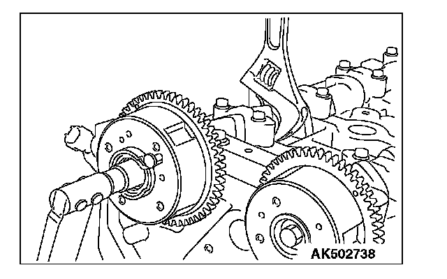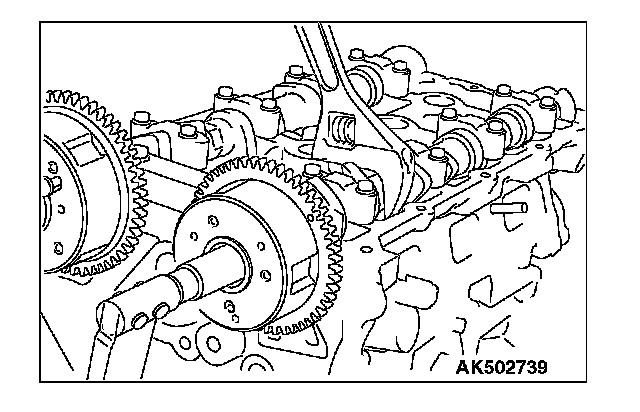^ Slowly insert the intake V.V.T. sprocket assembly into the normal position of the inlet camshaft assembly with its knock pin hole facing straight upward.