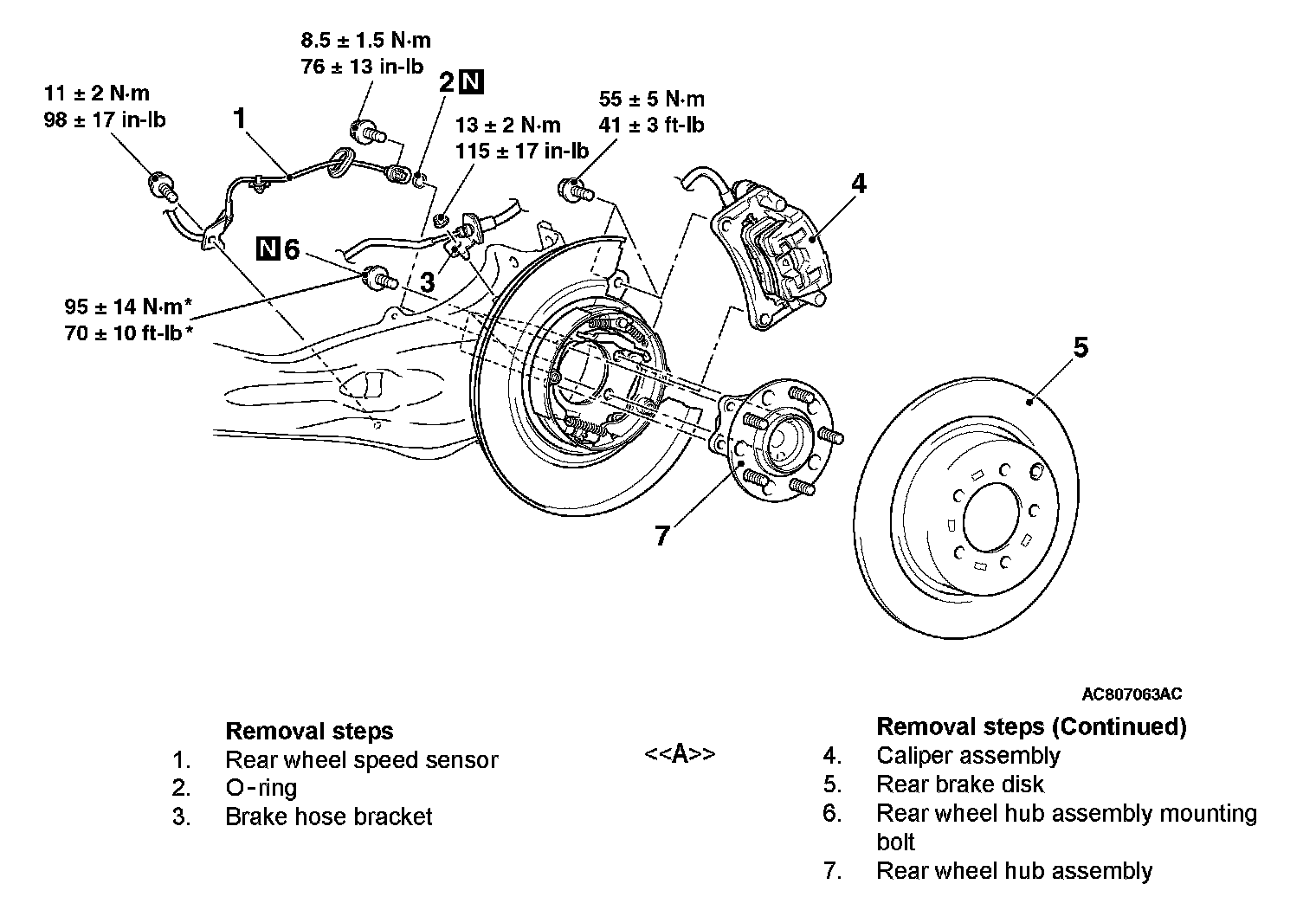 2. Secure the removed caliper assembly with a wire or other similar material at a position where it will not interfere with the removal and installation of the rear wheel hub assembly.