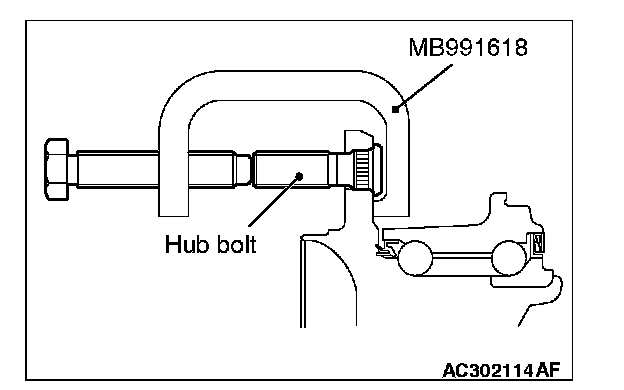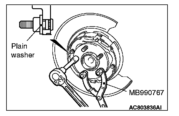 4. Install the plain washer to the new hub bolt, and install the bolt with a nut while holding the hub with special tool MB990767.