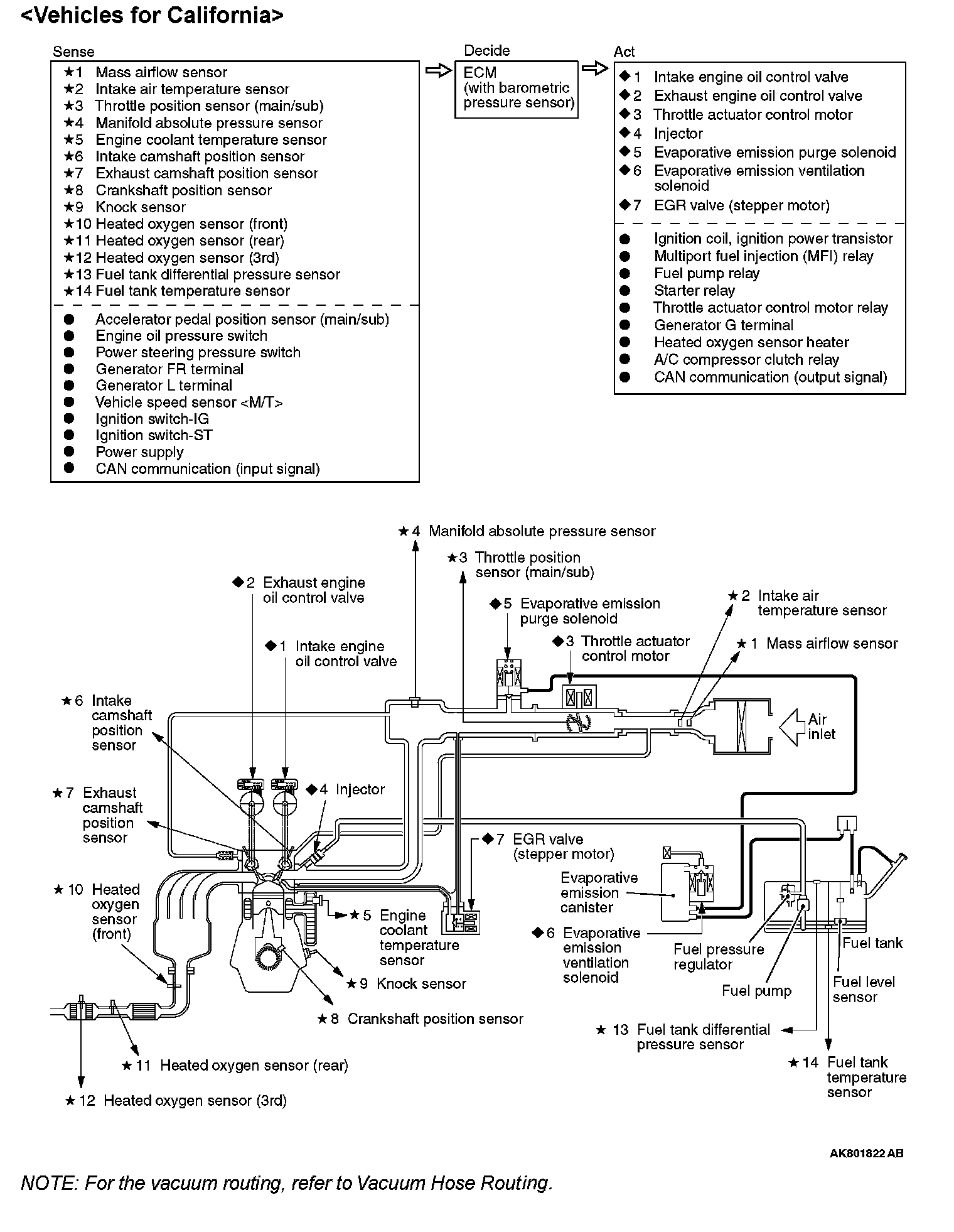 GENERAL INFORMATIONThe Multiport Fuel Injection System consists of sensors which detect the engine conditions, the ENGINE CONTROL MODULE (ECM) which controls the system based on signals from these sensors, and actuators which operate under the control of the ECM.