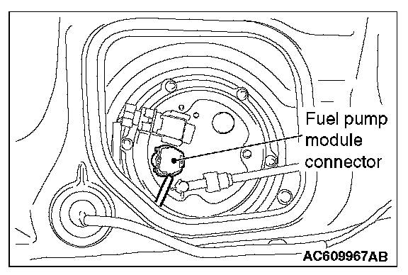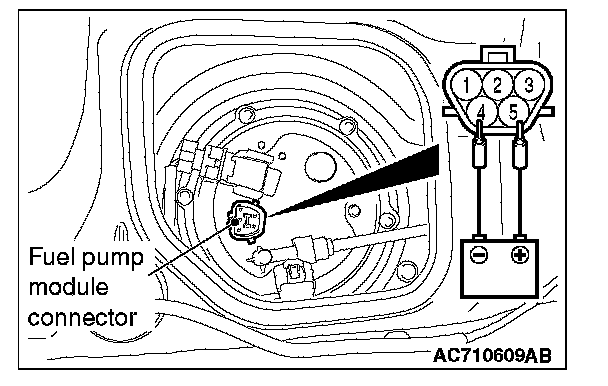 5. When the battery is connected to the fuel pump module connector (fuel pump module side), check that the fuel tank pump operating sound can be heard. When the fuel tank pump operating sound cannot be heard, replace the fuel tank pump.