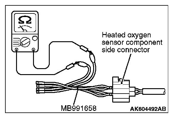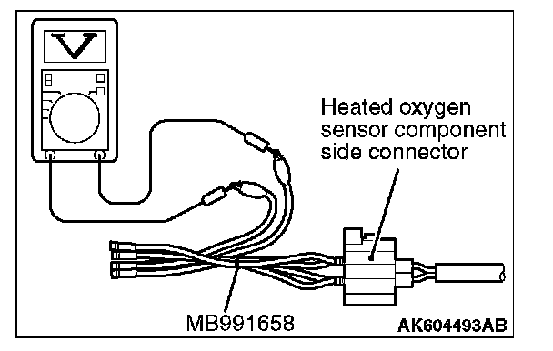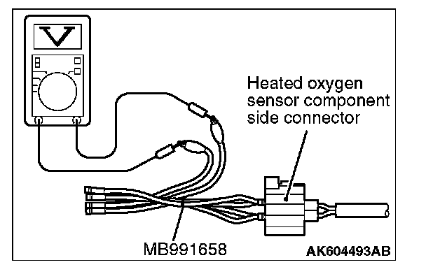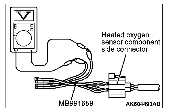 1. Disconnect the heated oxygen sensor connector and connect special tool MB991658 to the connector on the heated oxygen sensor side.