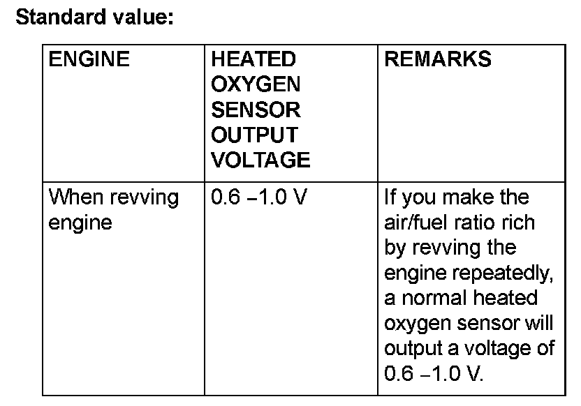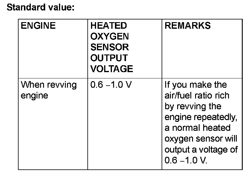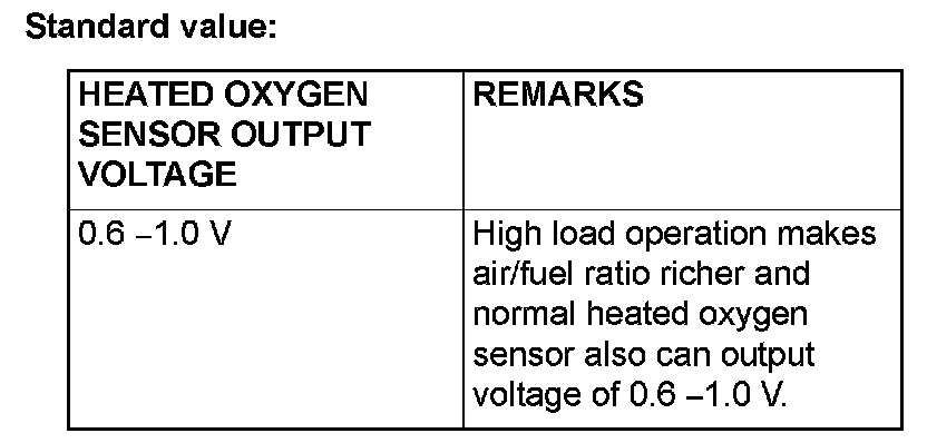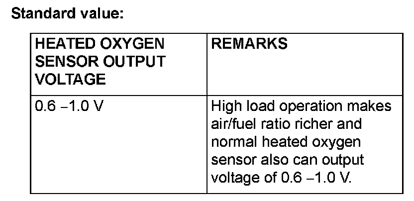 - If the temperature of sensing area does not reach the high temperature [of approximately 400° C (752° F) or more] even though the heated oxygen sensor is normal, the output voltage would be possibly low in spite of the rich air-fuel ratio.