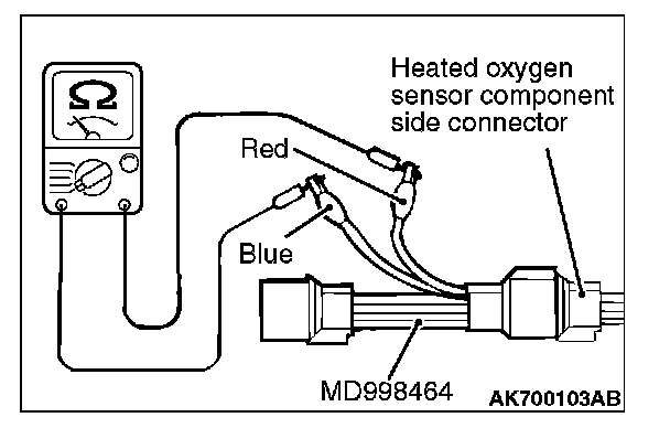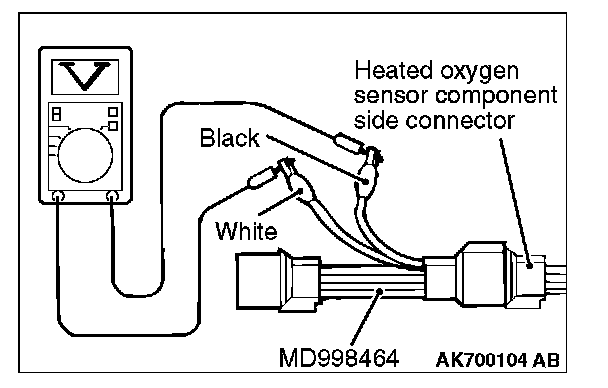 1. Disconnect the heated oxygen sensor connector and connect special tool MD998464 to the connector on the heated oxygen sensor side.