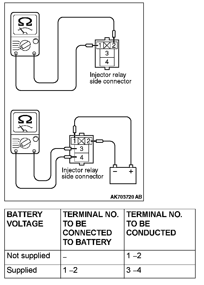 Inspect the injector relay for continuity in accordance with the chart shown below.
