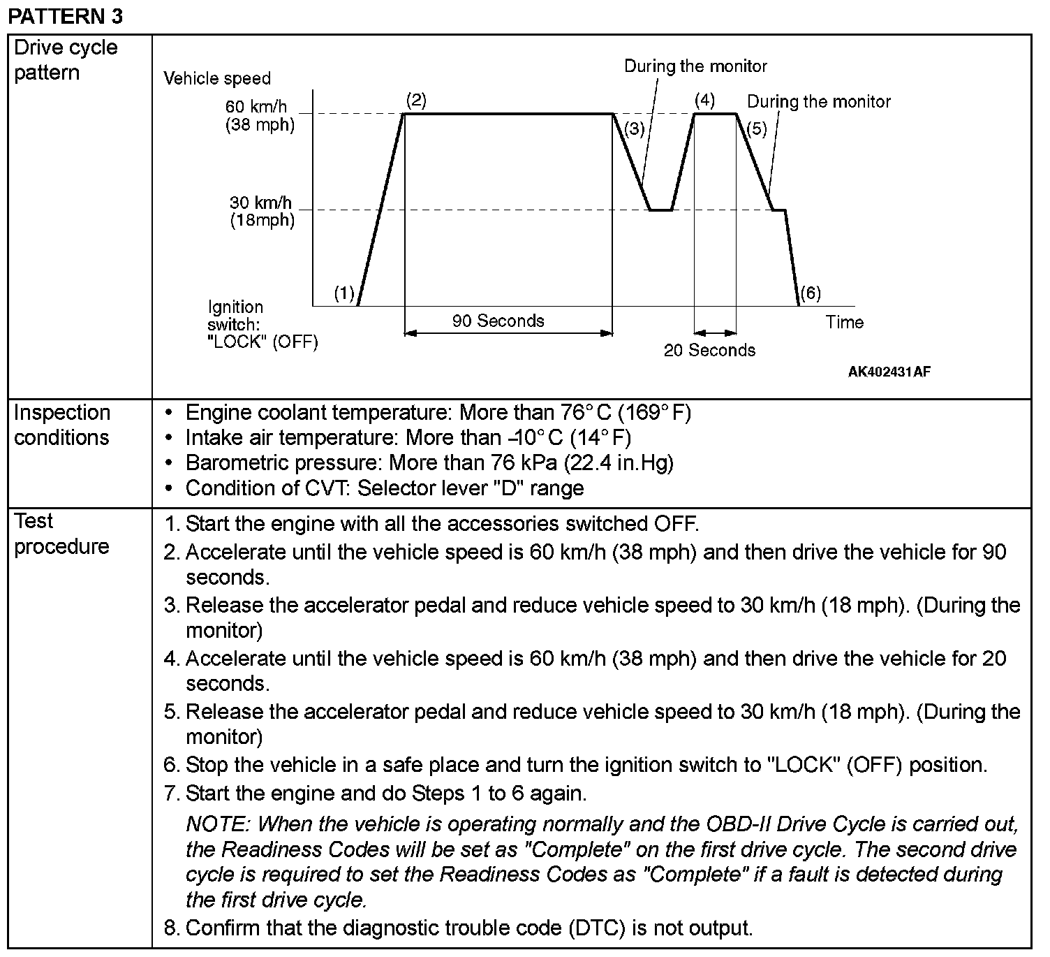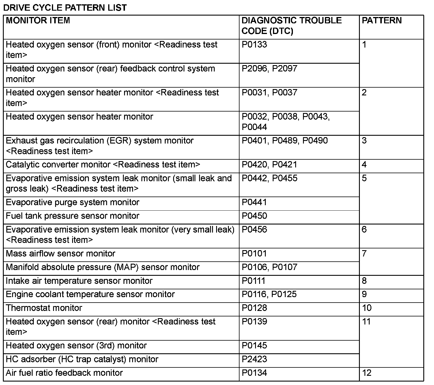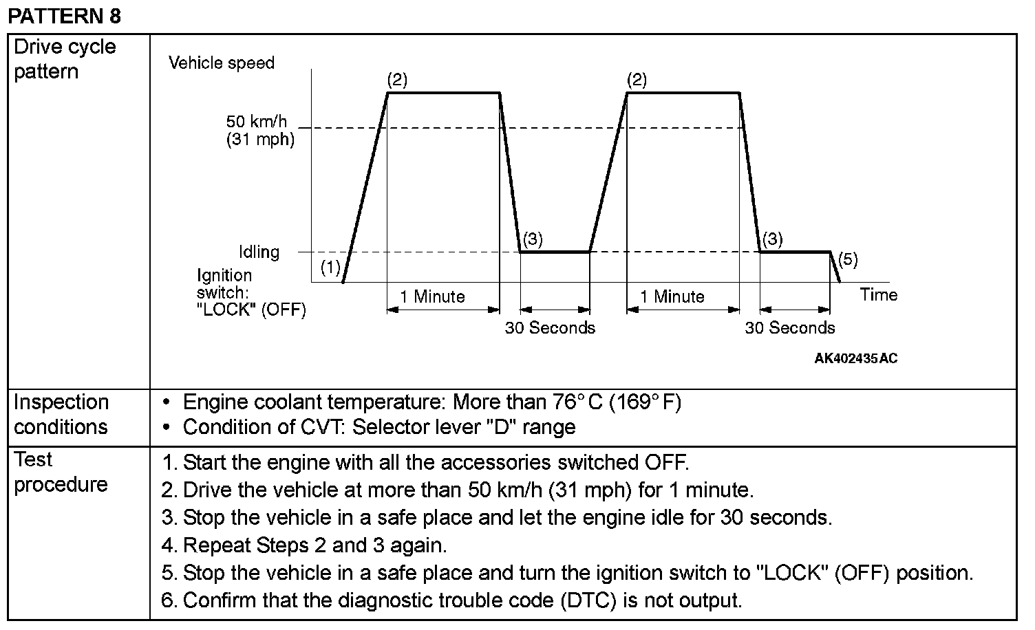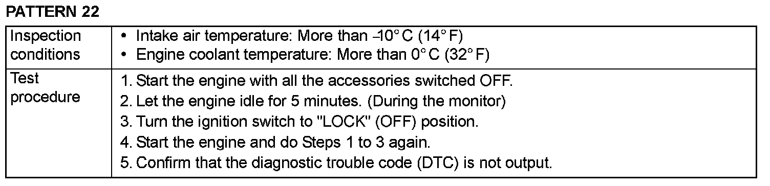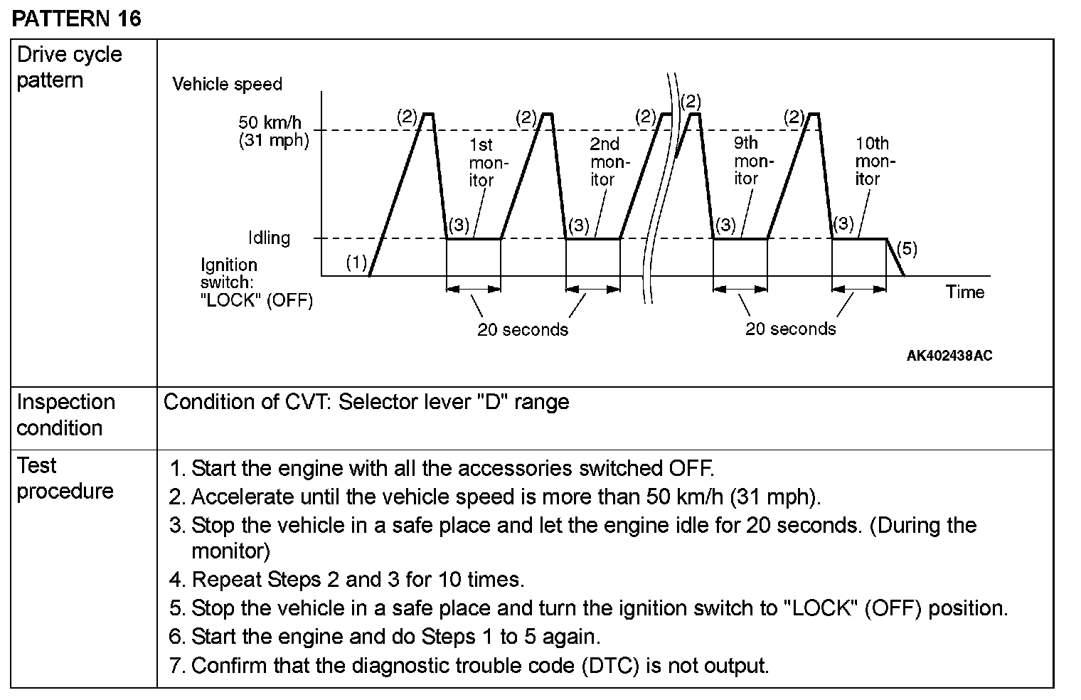 All kinds of diagnostic trouble codes (DTCs) can be monitored by carrying out a short drive according to the following 23 drive cycle patterns. In other words, doing such a drive regenerates any kind of trouble which involves illuminating the Malfunction Indicator Lamp (SERVICE ENGINE SOON or Check Engine Lamp) and verifies the repair procedure has been eliminated [the trouble the Malfunction Indicator Lamp (SERVICE ENGINE SOON or Check Engine Lamp) is no longer illuminated].