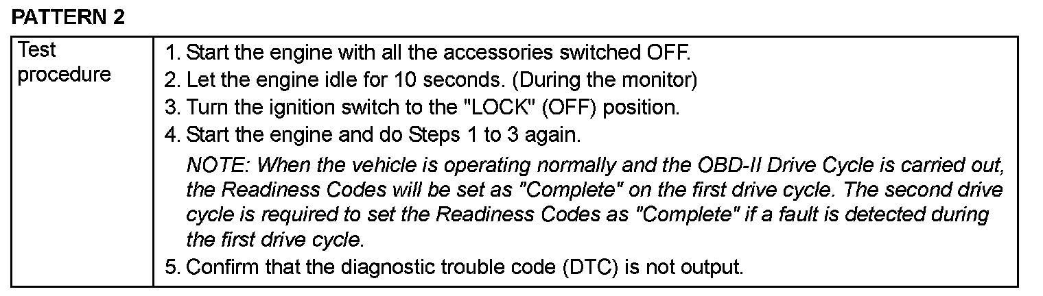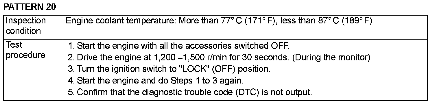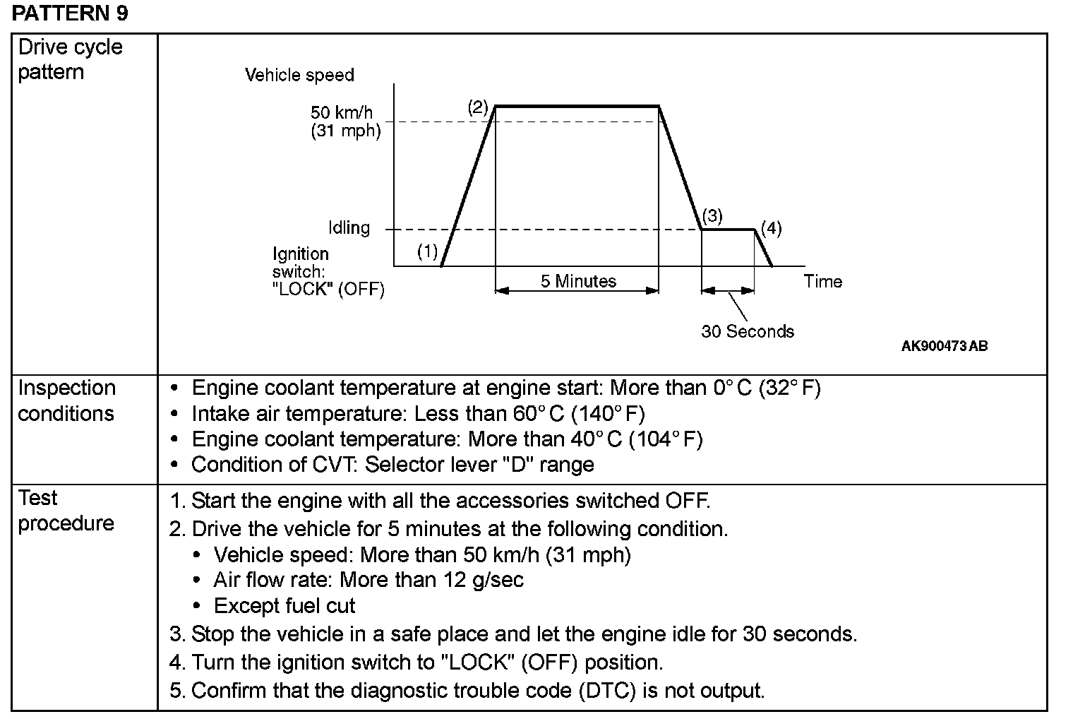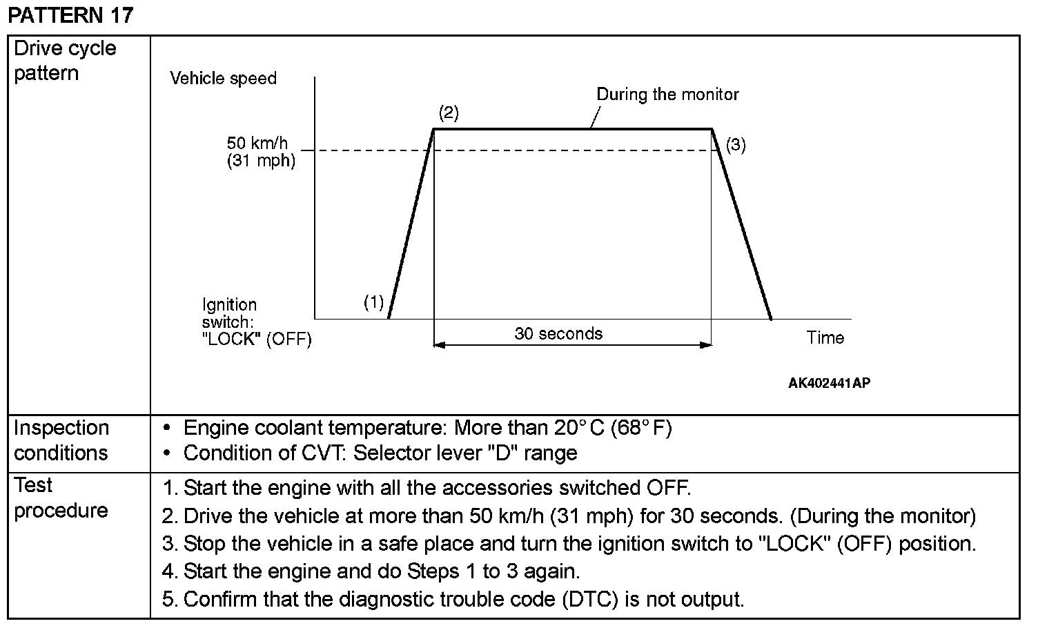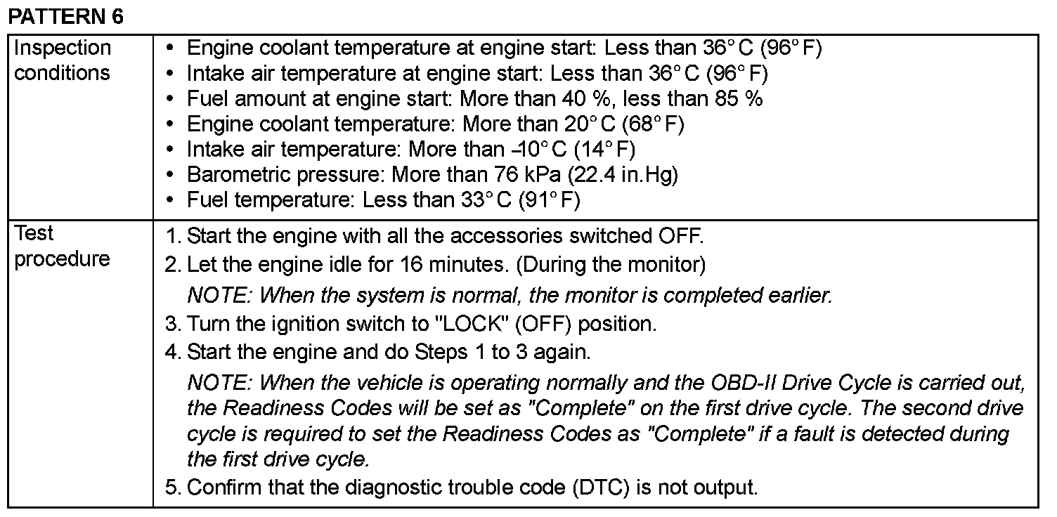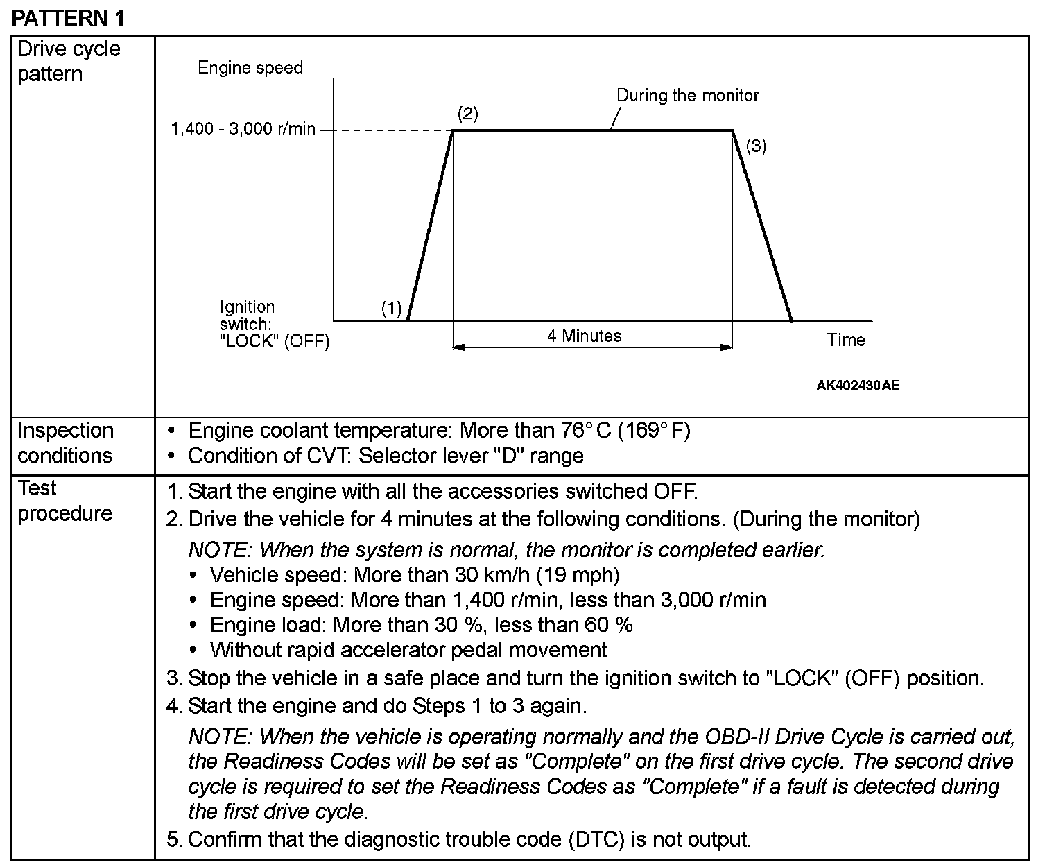 All kinds of diagnostic trouble codes (DTCs) can be monitored by carrying out a short drive according to the following 23 drive cycle patterns. In other words, doing such a drive regenerates any kind of trouble which involves illuminating the Malfunction Indicator Lamp (SERVICE ENGINE SOON or Check Engine Lamp) and verifies the repair procedure has been eliminated [the trouble the Malfunction Indicator Lamp (SERVICE ENGINE SOON or Check Engine Lamp) is no longer illuminated].