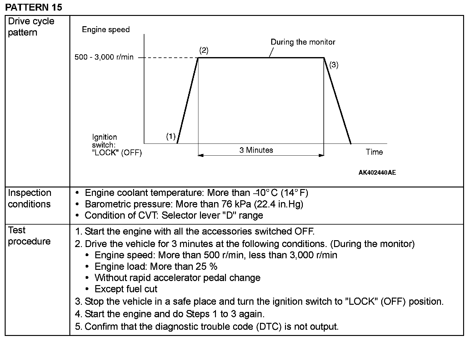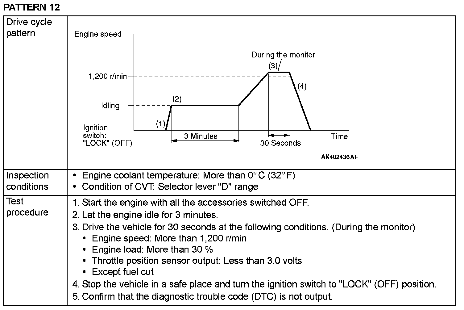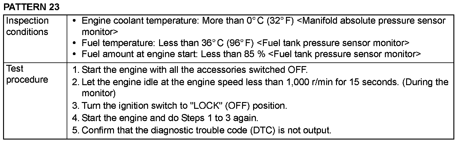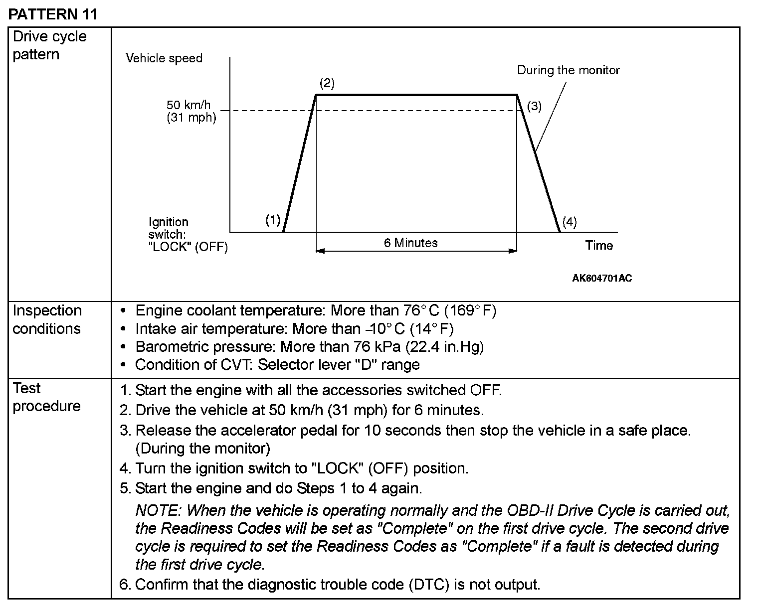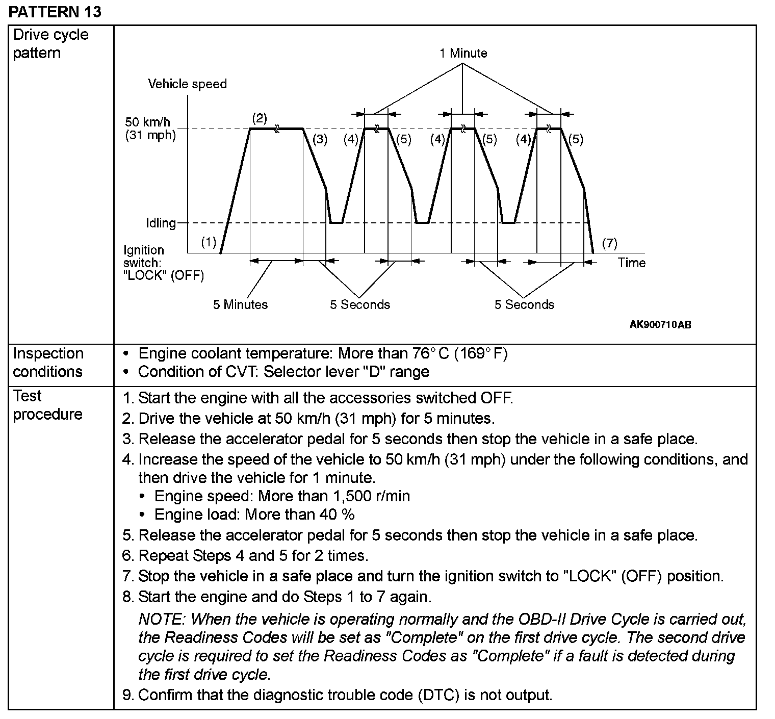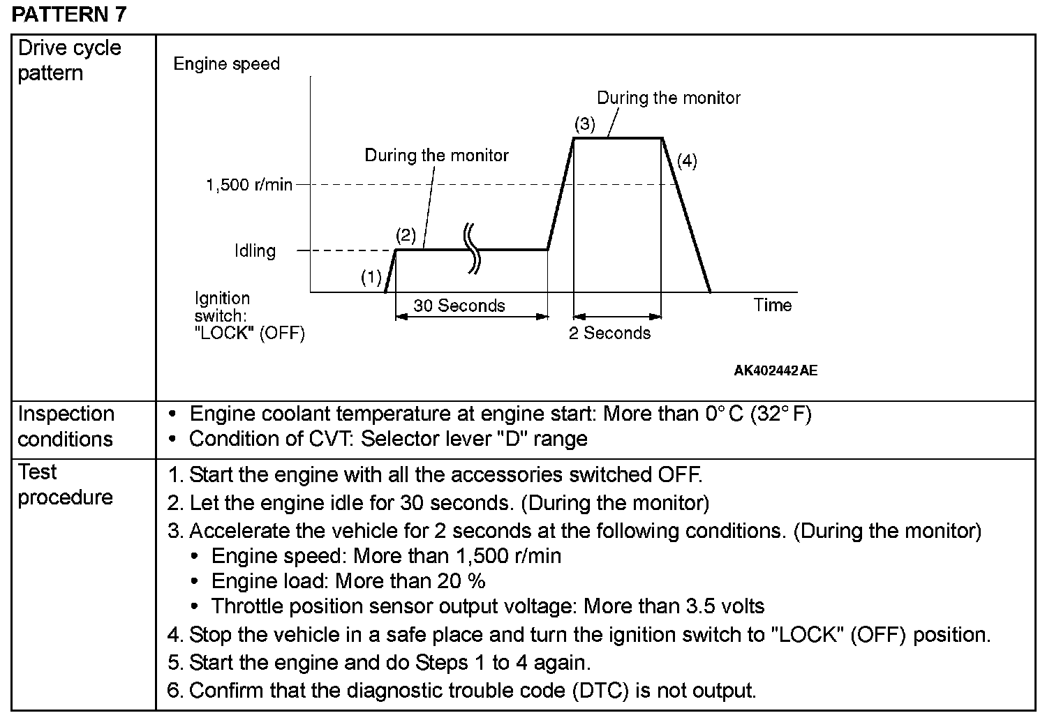All kinds of diagnostic trouble codes (DTCs) can be monitored by carrying out a short drive according to the following 23 drive cycle patterns. In other words, doing such a drive regenerates any kind of trouble which involves illuminating the Malfunction Indicator Lamp (SERVICE ENGINE SOON or Check Engine Lamp) and verifies the repair procedure has been eliminated [the trouble the Malfunction Indicator Lamp (SERVICE ENGINE SOON or Check Engine Lamp) is no longer illuminated].