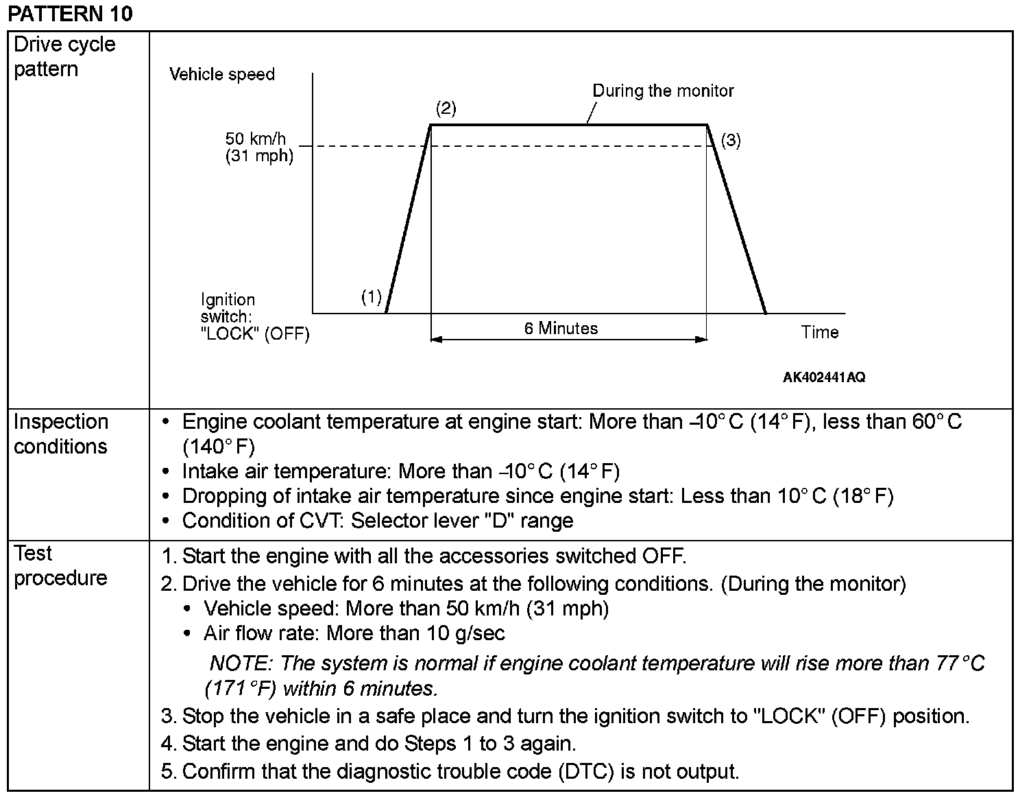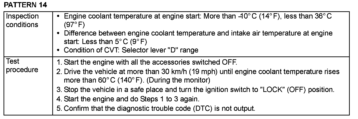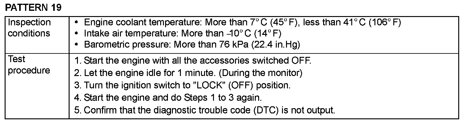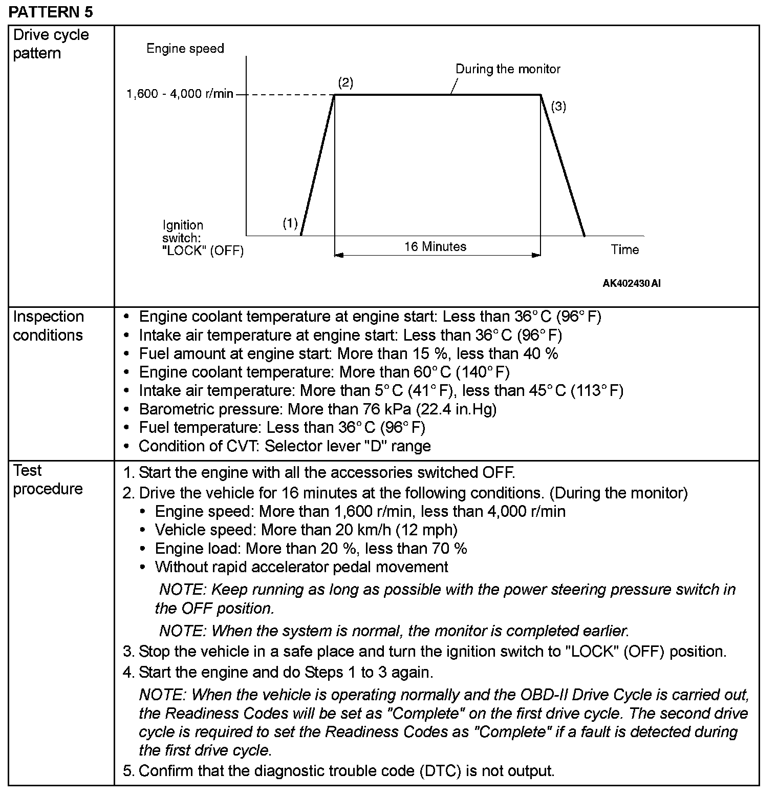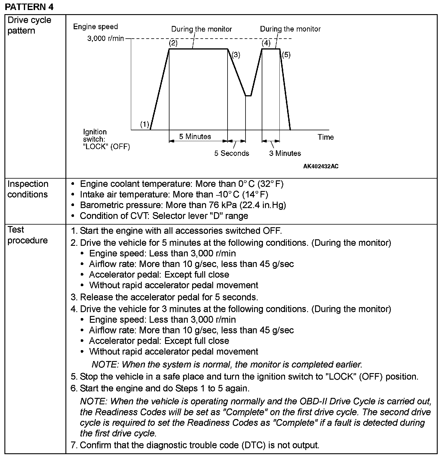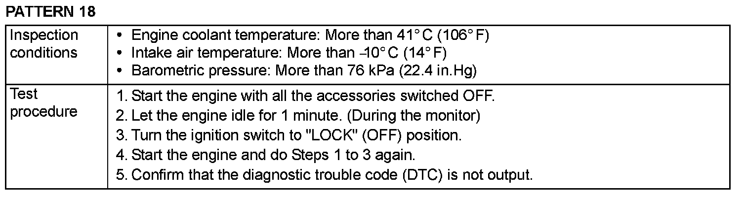 All kinds of diagnostic trouble codes (DTCs) can be monitored by carrying out a short drive according to the following 23 drive cycle patterns. In other words, doing such a drive regenerates any kind of trouble which involves illuminating the Malfunction Indicator Lamp (SERVICE ENGINE SOON or Check Engine Lamp) and verifies the repair procedure has been eliminated [the trouble the Malfunction Indicator Lamp (SERVICE ENGINE SOON or Check Engine Lamp) is no longer illuminated].