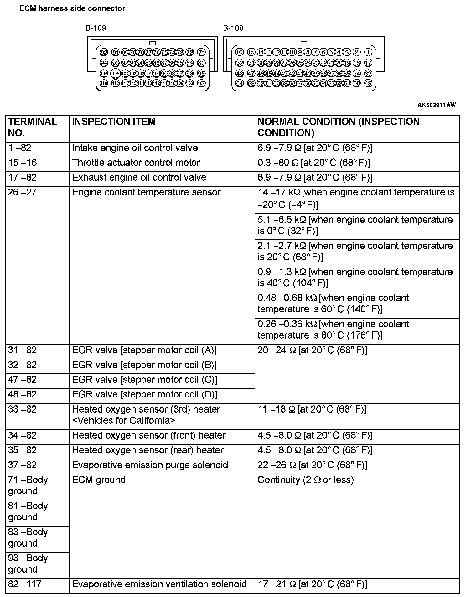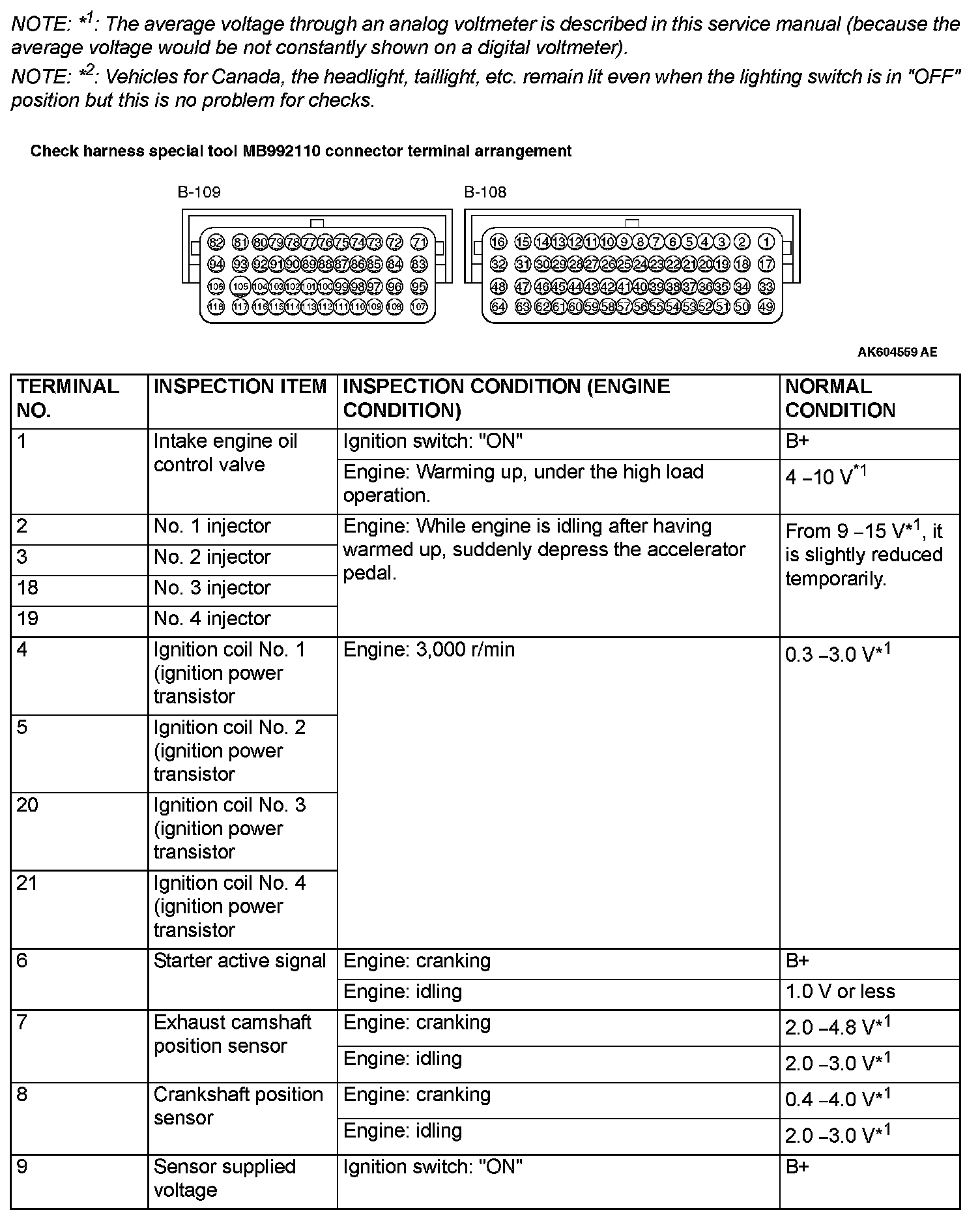 CHECK AT THE ENGINE CONTROL MODULE (ECM)1. Disconnect the ECM connectors B-108 and B-109, and connect check harness special tool MB992110 between the ECM connectors.