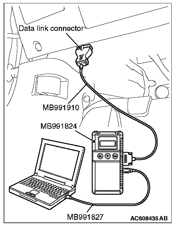 CAUTION: To prevent damage to scan tool MB991958, always turn the ignition switch to the "LOCK" (OFF) position before connecting or disconnecting scan tool MB991958.