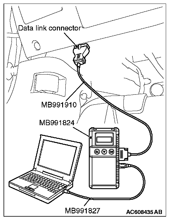 CAUTION: To prevent damage to scan tool MB991958, always turn the ignition switch to the "LOCK" (OFF) position before connecting or disconnecting scan tool MB991958.