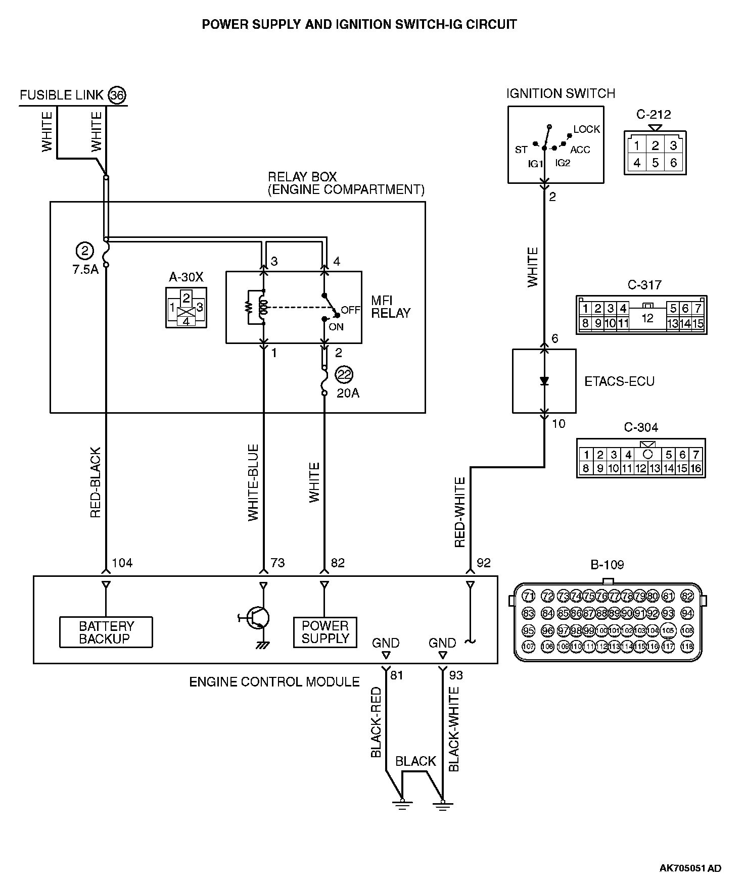 - When the ignition switch is turned to the "ON" position, battery positive voltage is applied to the ECM (terminal No. 92). When battery positive voltage is applied, the ECM turns the power transistor in the ECM "ON" and grounds the MFI relay coil. With this, the MFI relay turns "ON" the battery positive voltage is supplied to the ECM (terminals No. 82) from the MFI relay (terminal No. 2).