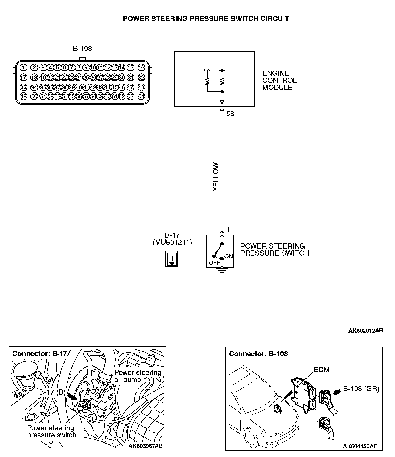 - A battery positive voltage is applied to the power steering pressure switch output terminal (terminal No. 1) from the ECM (terminal No. 58) via the resistor in the ECM.
