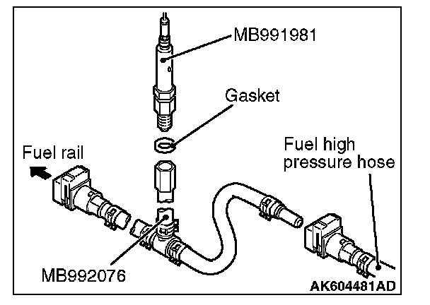 a. Via a gasket, install the special tool MB991981 (fuel pressure gauge set) into the special tool that has already assembled as described.