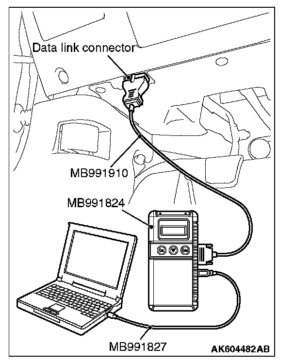 CAUTION: To prevent damage to scan tool MB991958, always turn the ignition switch to the "LOCK" (OFF) position before connecting or disconnecting scan tool MB991958.