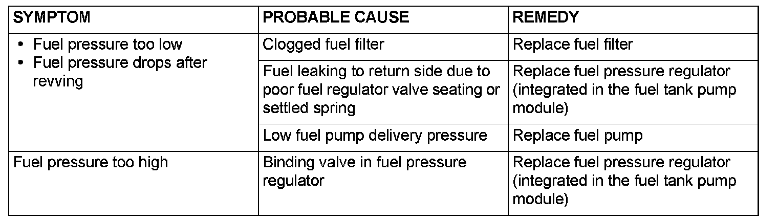 12. If any of fuel pressure measured in Step 10 to 11 is out of specification, troubleshoot and repair according to the table below.
