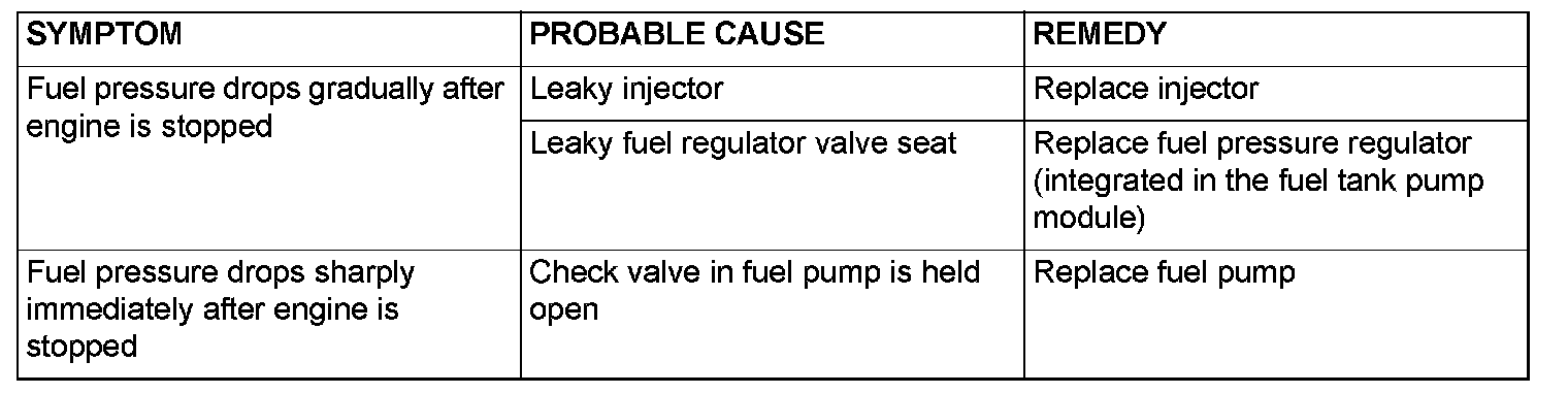 13. Stop the engine and observe fuel pressure gauge reading. It is normal if the reading does not drop within two minutes. If it does, observe the rate of drop and troubleshoot and repair according to the table below. Start, then stop the engine.